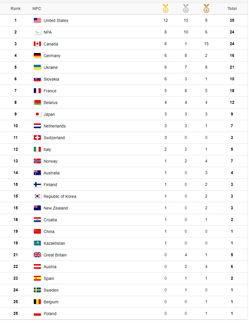 Лидирует же пока сборная США, у которой 12 золотых, 15 серебряных и 8 бронзовых медалей. Второй идет команда независимых паралимпийских атлетов (NPA) - 8, 10, 6, третья позиция у канадцев - 8, 1, 15, четвертая у немцев - 6, 8, 2.