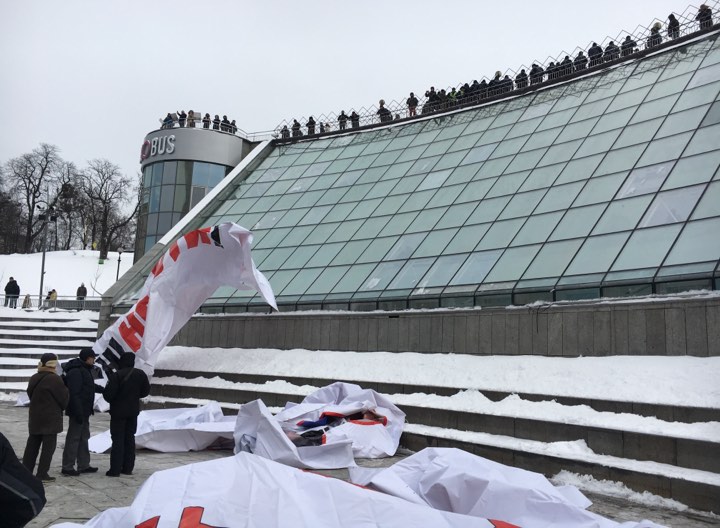 Сообщается, что плакаты провокационного и "антисаакашвилиевского" характера провисели буквально десять минут. На балкон "Глобуса" забрались сторонники РНС - среди них люди в чёрном камуфляже с надписями "Рух правых сил", и заняли эту территорию. Плакаты спустили вниз, балкон заняла сейчас полиция. Баннеры разрезают на земле ножами.