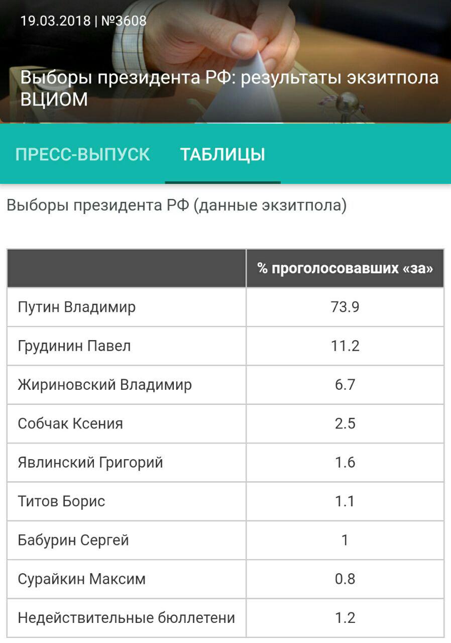 По результатам экзитпола ВЦИОМ, президентом Российской Федерации в первом туре избран Владимир Путин (73,9% голосов).