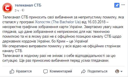 "Телеканал СТБ приносит свои извинения за недопустимую ошибку, которая произошла в программе от 16 марта - некорректное графическое изображение карты Украины. Данное изображение является неприятной для нас технической ошибкой и ни в коем случае не является официальной позицией канала СТБ о государственных границах Украины, потому Крым - это Украина!", - говорится в заявлении телеканала на Facebook-странице.
