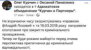 "Не тратя времени воспользовались поправкой Лозового и 16 марта направили ходатайство про закрытие криминального производства", - написал он и приложил текст ходатайства.