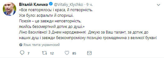 Сегодня, 19 марта, в День рождения украинской поэтессы Лины Костенко мэр Киева Виталий Кличко опубликовал ее четверостишие на своей странице в Twitter.