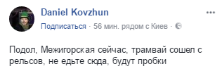 "Подол, Межигорская сейчас, трамвай сошел с рельсов, не едьте сюда, будут пробки", - написал он и опубликовал фото трамвая, который перегородил улицу.