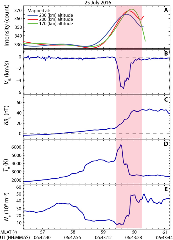 Связь оптического свечения (розовая область) с данными по электронной плотности и температуре, скоростью дрейфа ионов и возмущениям магнитного поля по данным спутников Swarm. Elizabeth A. MacDonald et al./Science Advances, Vol. 4, no. 3 (14 Mar 2018), фото: nplus1.ru