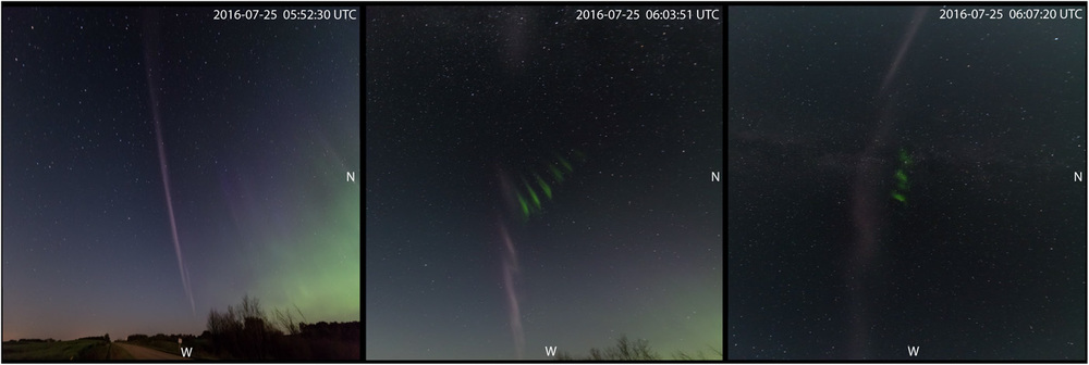 Ночью 25 июля 2016 года Нотани Бурасса (Notanee Bourassa), канадский астрофотограф-любитель с 30-летним стажем, провел съемку необычных сияний в течение 19 минут. В это же время такое же свечение в небе регистрировалось наземным массивом камер ASIs (All-Sky Imagers), сетью фотометров MSPs (Meridian Scanning Photometers) и аппаратами миссии Swarm. С Земли наблюдалась тонкая дуга фиолетово-белого цвета и неустойчивая структура зеленого цвета, напоминающая забор.