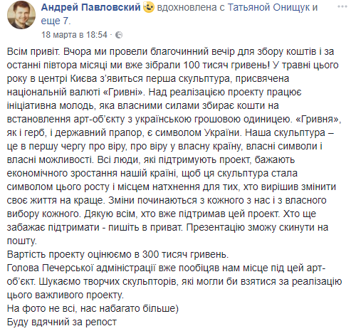 "Вчера мы провели благотворительный вечер для сбора средств и за последние полтора месяца мы уже собрали 100 000 гривен! В мае этого года в центре Киева появится первая скульптура, посвященная национальной валюте - Гривне. Над реализацией проекта работает инициативная молодежь, которая собственными силами собирает средства на установку арт-объекта с украинской денежной единицей. Гривна, как и герб, и государственный флаг, является символом Украины", - написал в соцсети Андрей Павловский и добавил, что будущая скульптура посвящена вере в собственную страну, в собственные символы и собственные возможности.