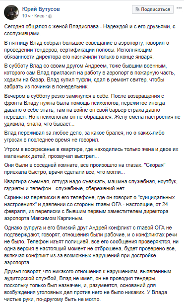 "Скрины из переписки в его телефоне, где он говорит о "суицидальных настроениях" и давлении со стороны главы ОГА - настоящие, от 24 февраля, из переписки с бывшим первым заместителем директора аэропорта Максимом Карпиным. Однако супруга и его близкий друг Андрей конфликт с главой ОГА не подтверждают, говорят, отношения были рабочие, и о конфликтах речи не было. Телефон изъят полицией, все его сообщения проверяются", - написал журналист.