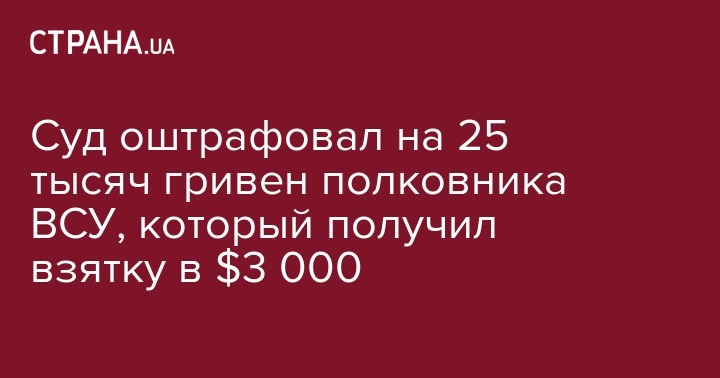 Соломенский райсуд Киева оштрафовал на 25,5 тысяч гривен полковника ВСУ, который получил взятку в размере $3 тысячи. А также обязал его оплатить судебные издержки на сумму в 3 тысячи гривен.