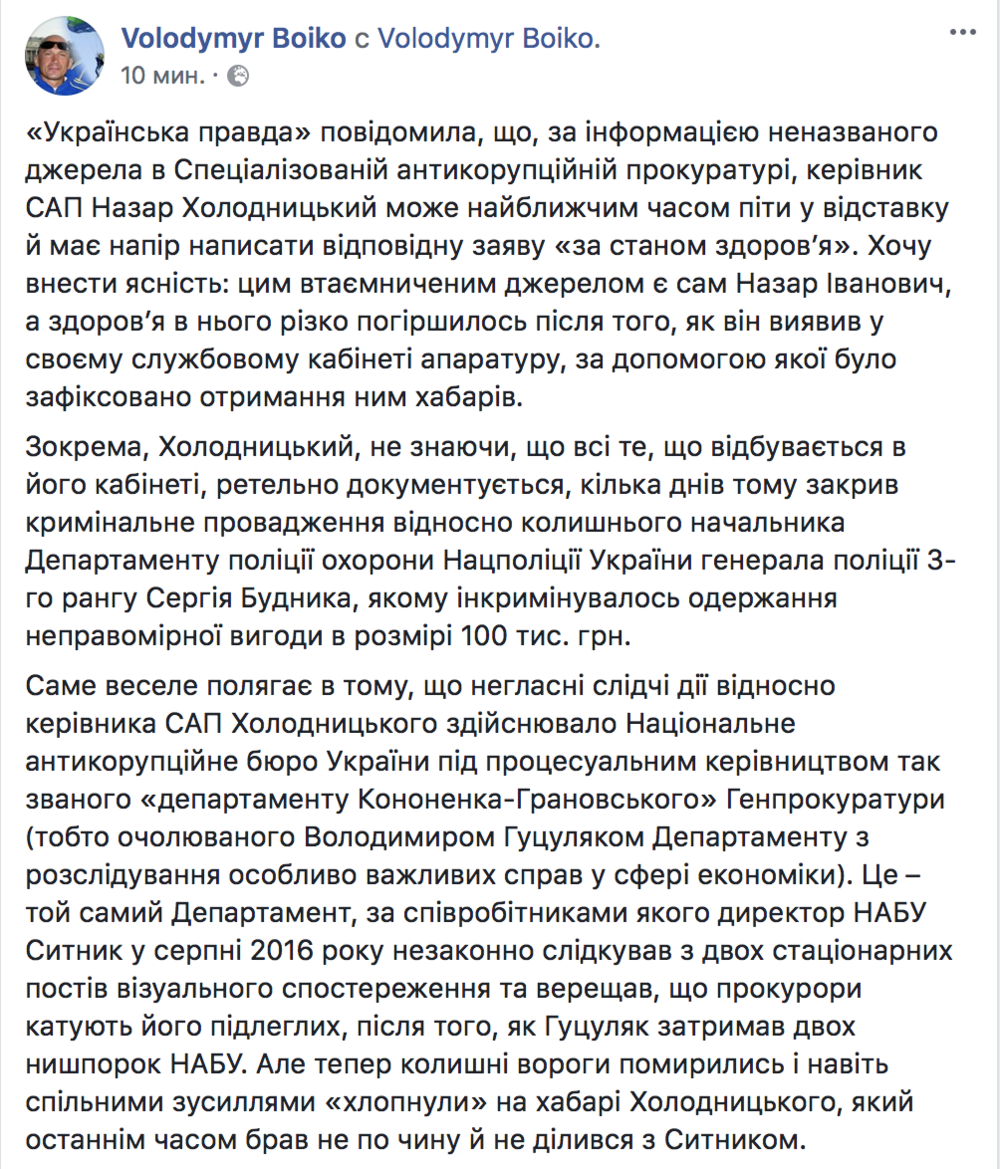 Тем временем, известный журналист Владимир Бойко пишет, что все эти слухи появились неспроста. По его данным, НАБУ действительно вело прослушку Холодницкого и даже якобы зафиксировала некоторые переговоры на коррупционные темы. В частности о взятке.