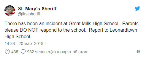 Офис шерифа округа Сент-Мэри подтвердил в Twitter инцидент в школе Great Mills и попросил родителей не приводить детей на занятия. Других подробностей не сообщается.