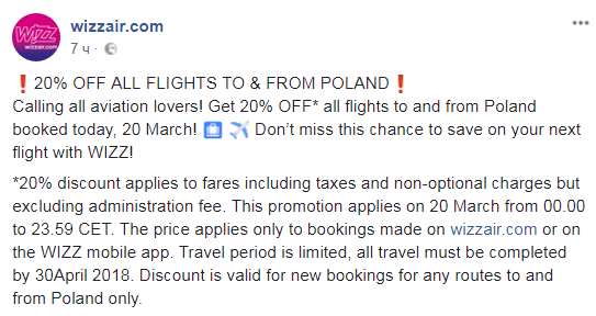 Акция будет действовать на все авиарейсы в Польшу и из Польши при бронировании авиабилетов до 23:59 20 марта по центрально-европейскому времени (01:00 ночи 21 марта по Киеву).