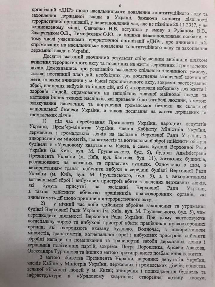Судя по документу, есть даже видеозапись разговора в кабинете командира воинской части спецназа в Хмельницком. В том же кабинете есть собственноручно нарисованный Савченко план Верховной Рады.