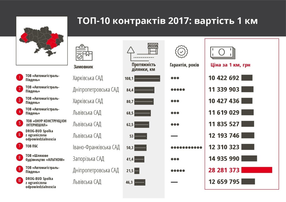В этой связи средняя стоимость ремонта 1 км дороги в соответствии с другими девятью контрактами составляет более 11,24 млн грн, что почти равняется стоимости капитальных ремонтов территориальных дорог государственного значения, которые также вошли в ТОП-10 контрактов и выполняются польской компанией DROG-BUD Spolka z ograniczona odpowiedzialnoscia.