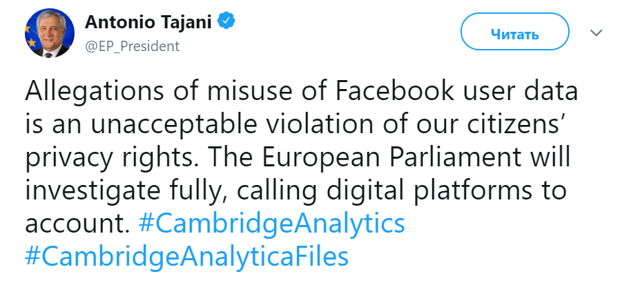 Обеспокоились и в ЕС. Расследованием утечки данных займется Европарламент, написал его глава Антонио Тальяни. "Обвинения в недобросовестном использовании данных пользователей Facebook – это неприемлемое нарушение прав наших граждан на частную жизнь", – говорит руководитель ЕП.
