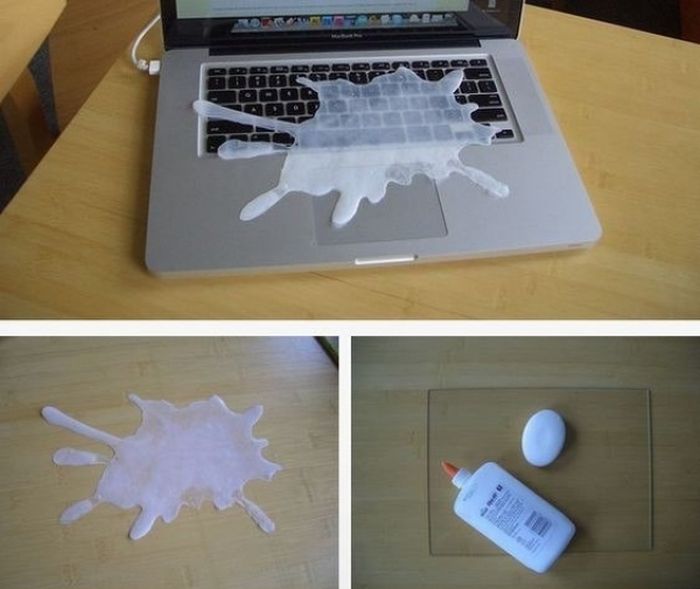 Розыгрыш для коллег: сделайте на стекле кляксу из клея ПВА, аккуратно снимите ее с помощью лезвия или канцелярского ножа и положите на клавиатуру ноутбука жертвы.