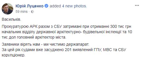 "Васильков. Прокуратурой АРК совместно с СБУ задержаны при получении 300 тыс. грн начальник отдела государственной архитектурно строительной инспекции и 10 тыс. долл. главный архитектор города", – написал генеральный прокурор.
