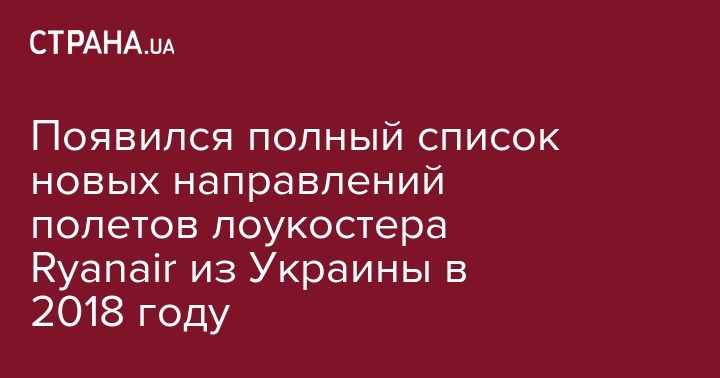 Появился полный список новых направлений полетов лоукостера Ryanair из Украины в 2018 году