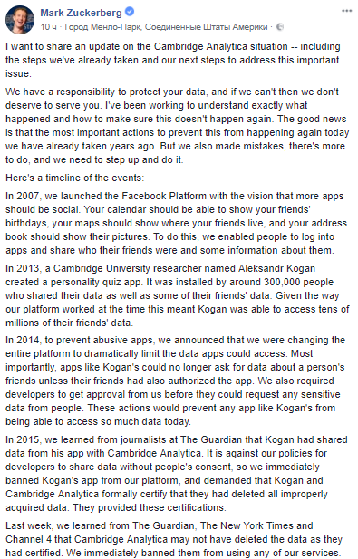 Напомним, что Цукерберг объяснил, как Cambridge Analytica получила доступ к данным пользователей сети.