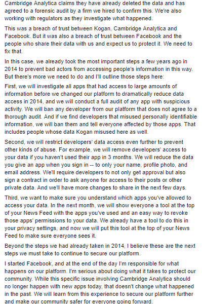 Цукерберг опубликовал первое заявление по поводу скандала с Cambridge Analytica