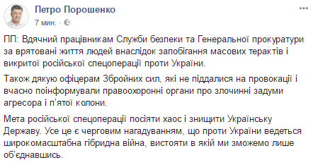Президент Петр  Порошенко поблагодарил сотрудников СБУ и ГПУ "за спасенные жизни людей в результате предотвращения массовых терактов и разоблаченной российской спецоперации против Украины".