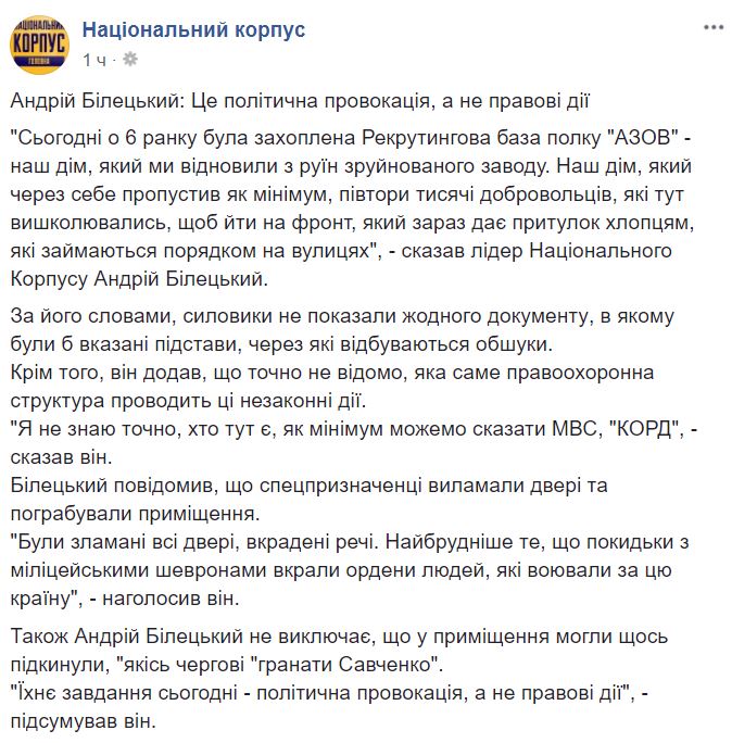 "Сегодня в 6 утра была захвачена Рекрутинговая база полка "АЗОВ"- наш дом, который мы восстановили из руин разрушенного завода. Наш дом, который через себя пропустил как минимум, полторы тысячи добровольцев на фронт, который сейчас дает приют ребятам, которые занимаются порядком на улицах", - сказал он.