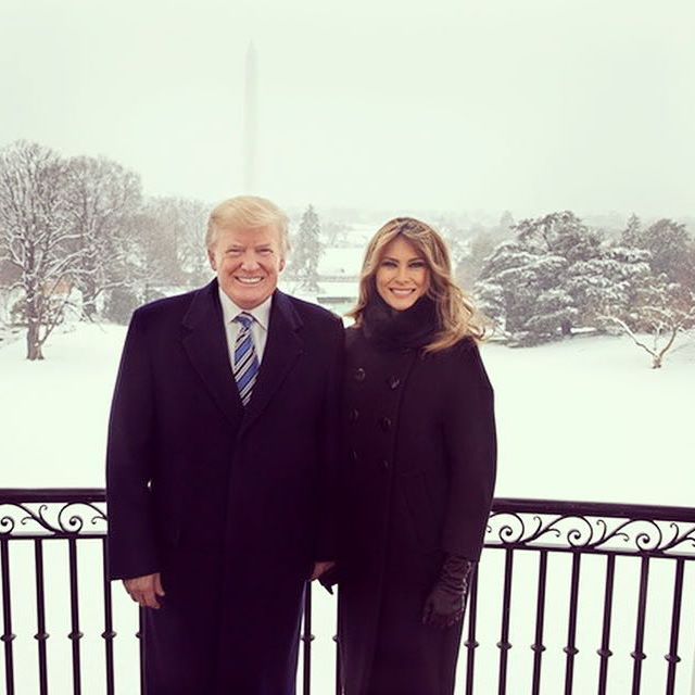 На снимке Мелания и Дональд держатся за руки на фоне заснеженного двора Белого дома, они выглядят счастливыми и улыбаются.
