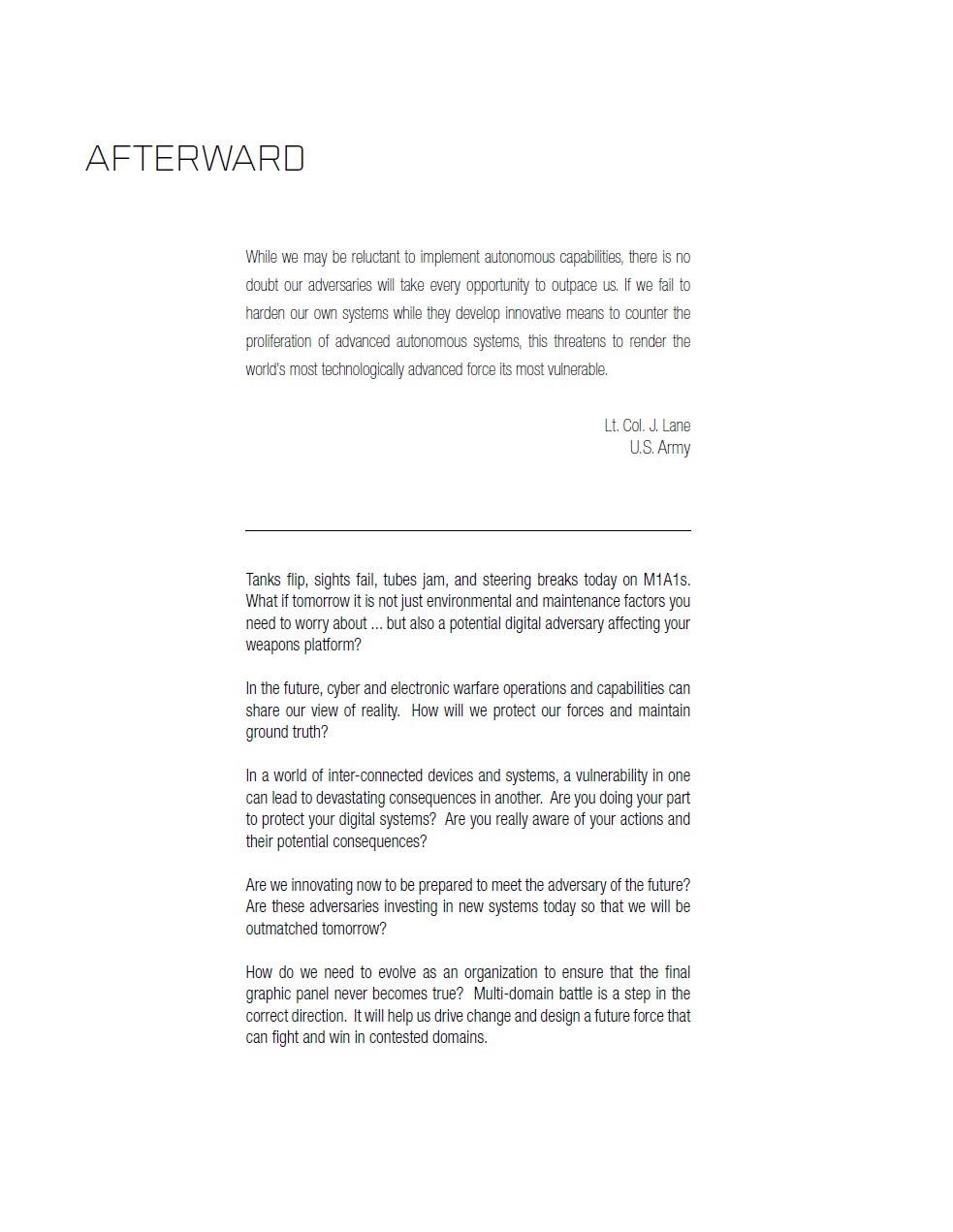 Комиксы показывают ущерб, который могут нанести кибертехнологии войскам, а также последствия их применения. В комиксе "Тихое крушение" рассматривается сценарий объединения Румынии и Молдавии. В ответ на образование этого союза Россия начинает масштабные учения на границе. На территории объединившихся стран учения начинают и войска НАТО.