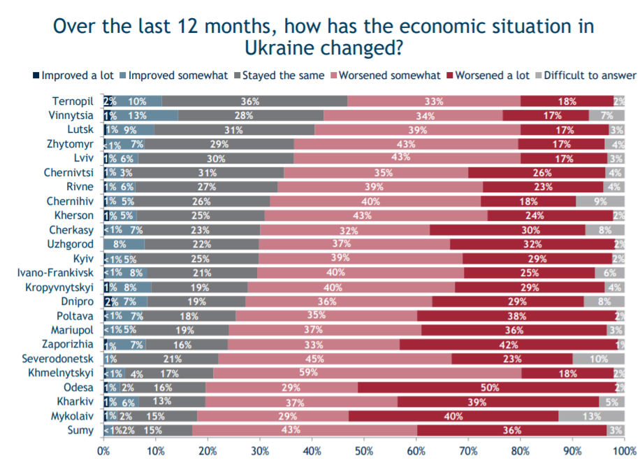 Впрочем, и здесь картина зеркальная – доля ответов "состояние ухудшилось" оказалась самой большой. Хуже всего дела обстоят в Запорожье (74% заявили об ухудшении), Николаеве (79%) и Сумах (81%).