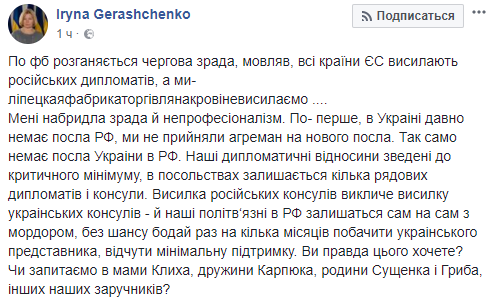 Украина не высылает российских дипломатов, поскольку высылка украинских консулов ​​оставит украинских политзаключенных в РФ без поддержки. Об этом написала представитель Украины в гуманитарной подгруппе Трехсторонней контактной группы Ирина Геращенко в Facebook.