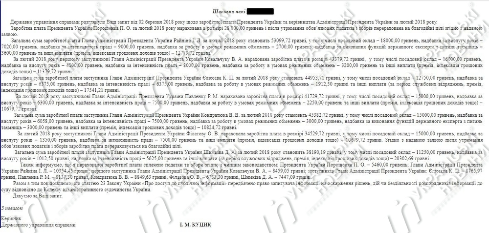 При этом у двух из пяти заместителей главы Администрации президента зарплата за февраль была выше, чем у Ковальчука: 45 383 гривны у Валерия Кондратюка и 44 954 гривны у Константина Елисеева.