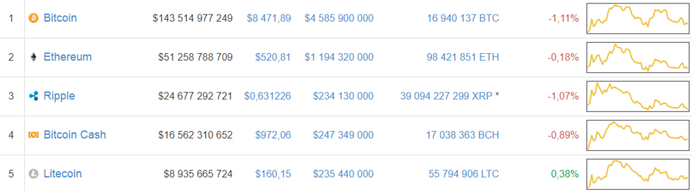Криптовалюта биткоин за сутки подешевела на 1% до $8 471. Немного потеряли в цене и другие криптовалюты.