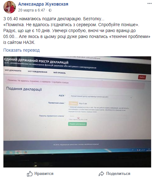 Радует, что еще 10 дней. Вечером попробую, ночью или рано утром - до 05.00 ... Но как-то в этом году очень рано начались «технические проблемы» с сайтом НАПК", - написала судья Александра Жуковская.