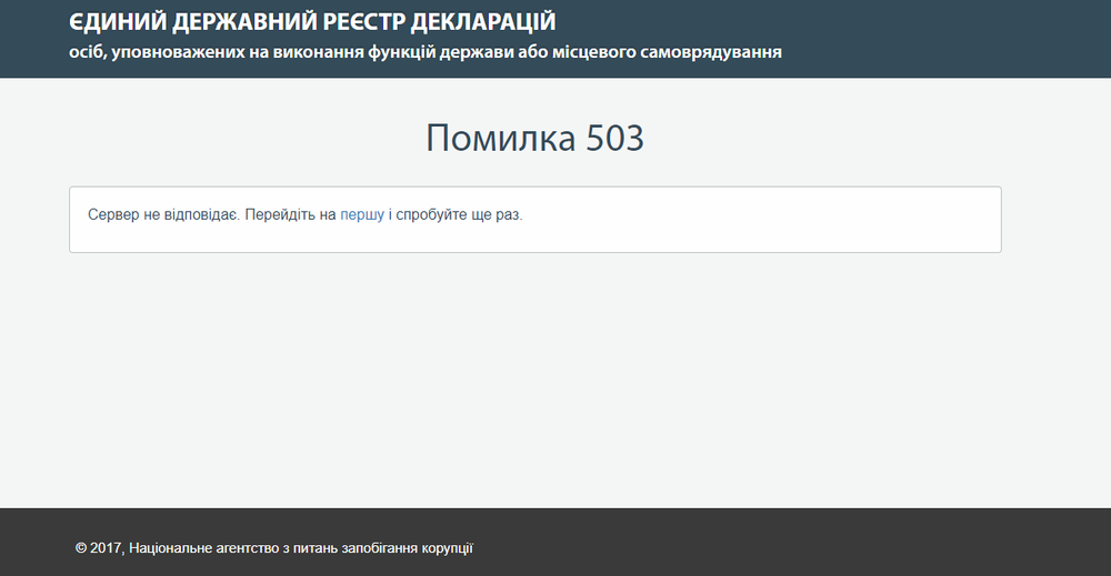 Единый государственный реестр электронных деклараций внезапно начал демонстрировать сбои в работе. При заходе на ресурс появляется надпись "Ошибка 503" и предлагает повторить попытку.