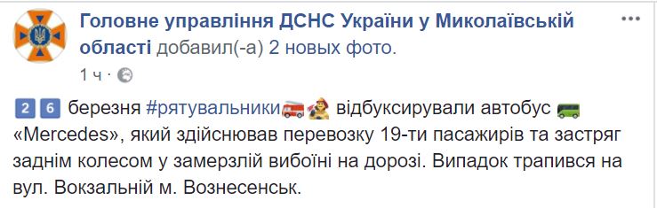 В Николаевской области в ледяной яме на дороге застрял пассажирский автобус Херсон-Москва. Об этом сообщает пресс-служба ГосЧС на странице Facebook.