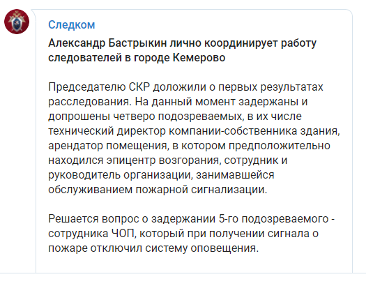 Следователи задержали и допросили четырех подозреваемых. Решается вопрос о задержании пятого подозреваемого. Это сотрудник частного охранного предприятия, который при получении сигнала о пожаре отключил систему оповещения, установило следствие.