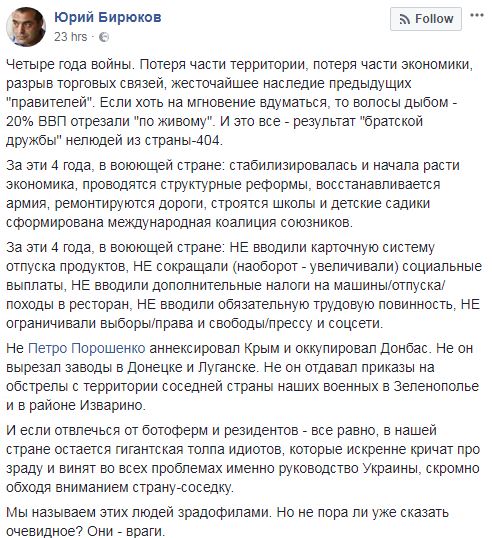 "Мы называем этих людей зрадофилами. Но не пора ли уже сказать очевидное? Они – враги", - заявляет Бирюков.