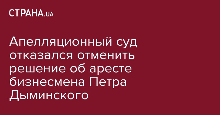 Апелляционный суд Киева не удовлетворил апелляционную жалобу стороны защиты украинского бизнесмена Петра Дыминского на решение Печерского районного суда Киева от 1 марта о применении в отношении Дыминского меры пресечения в виде содержания под стражей.