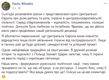 "Сегодня разговаривали вместе с представителями стран Центральной Европы о судьбе региона и роли Украины в центральноевропейском сообществе. Среди собеседников – журналисты, писатели, бывшие политики. Дискуссия была глубокой и нужной. (…) В дружеской беседе историк и журналист из Польши Земовит Щерек спросил, почему бы Украине не ввести наряду с кириллицей латиницу", – написал глава МИД на странице в Facebook в понедельник.
