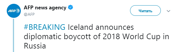 "Исландия объявила дипломатический бойкот проведению Чемпионата мира-2018 в России", - говорится в сообщении в Twitter.