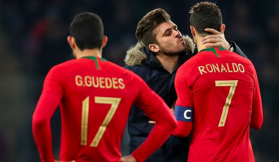 Португалия - Голландия. Выбежавший на поле футбольный фанат чмокнул Роналду и остановил матч. Фото поцелуя и видео голов