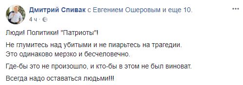 Политик, общественный деятель Дмитрий Спивак: "Люди! Политики! "Патриоты"! Не глумитесь над убитыми и не пиарьтесь на трагедии. Это одинаково мерзко и бесчеловечно. Где бы это не произошло, и кто бы в этом не был виноват. Всегда надо оставаться людьми!"