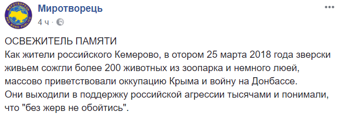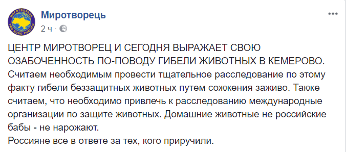 Завуалированно циничный пост написал "Миротворец". Он выразил озабоченность "по поводу гибели животных в Кемерово" (в торговом центре сгорел зоопарк). А что касается гибели детей, в тексте поста прозвучал намек, что "еще нарожают".