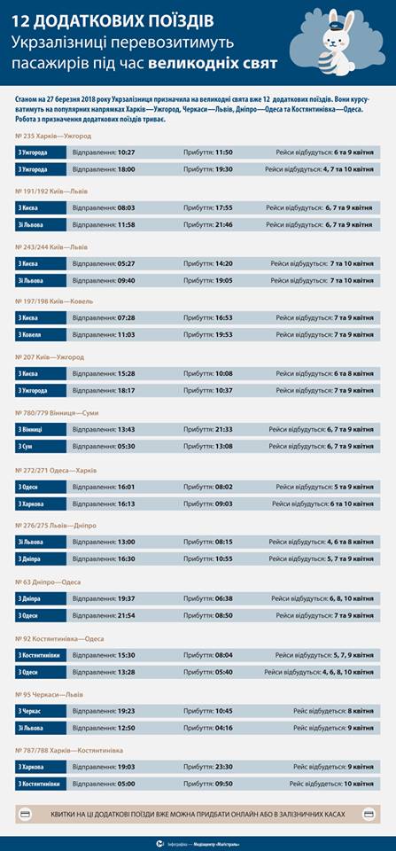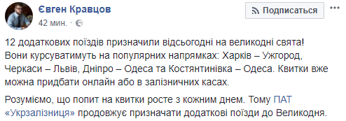 "Укрзализныця" назначила на пасхальные праздники 12 дополнительных поездов, которые будут курсировать на популярных маршрутах. Об этом сообщил и.о. главы компании Евгений Кравцов на своей странице в Facebook и добавил, что спрос на железнодорожные билеты перед праздниками растет с каждым днем.