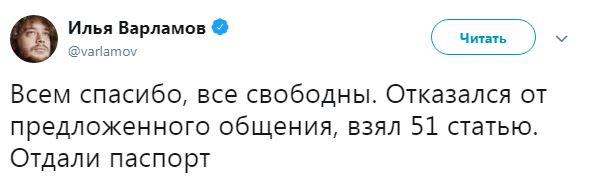 "Всем спасибо, все свободны. Отказался от предложенного общения, взял 51 статью (Конституции РФ, разрешает не свидетельствовать против себя - Прим. Ред.). Отдали паспорт", - написал он.