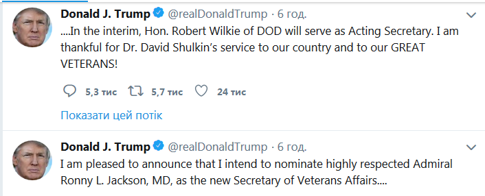 "Я рад сообщить, что я хочу назначить уважаемого адмирала Ронни Джексона, доктора медицинских наук, новым министром по делам ветеранов. В данный момент и.о. на этой должности будет Роберт Уилки из Пентагона. Я благодарен Дэвиду Шулькину за службу нашей стране и нашим великим ветеранам!", - написал Трамп.