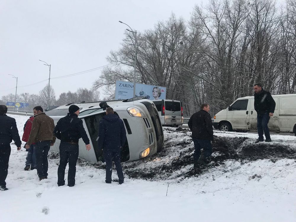 Снег и скользкая дорога. На Бориспольской трассе перевернулся микроавтобус