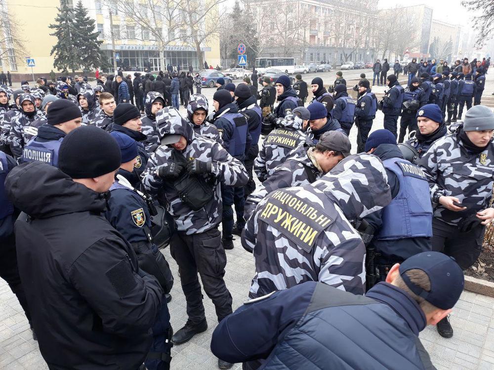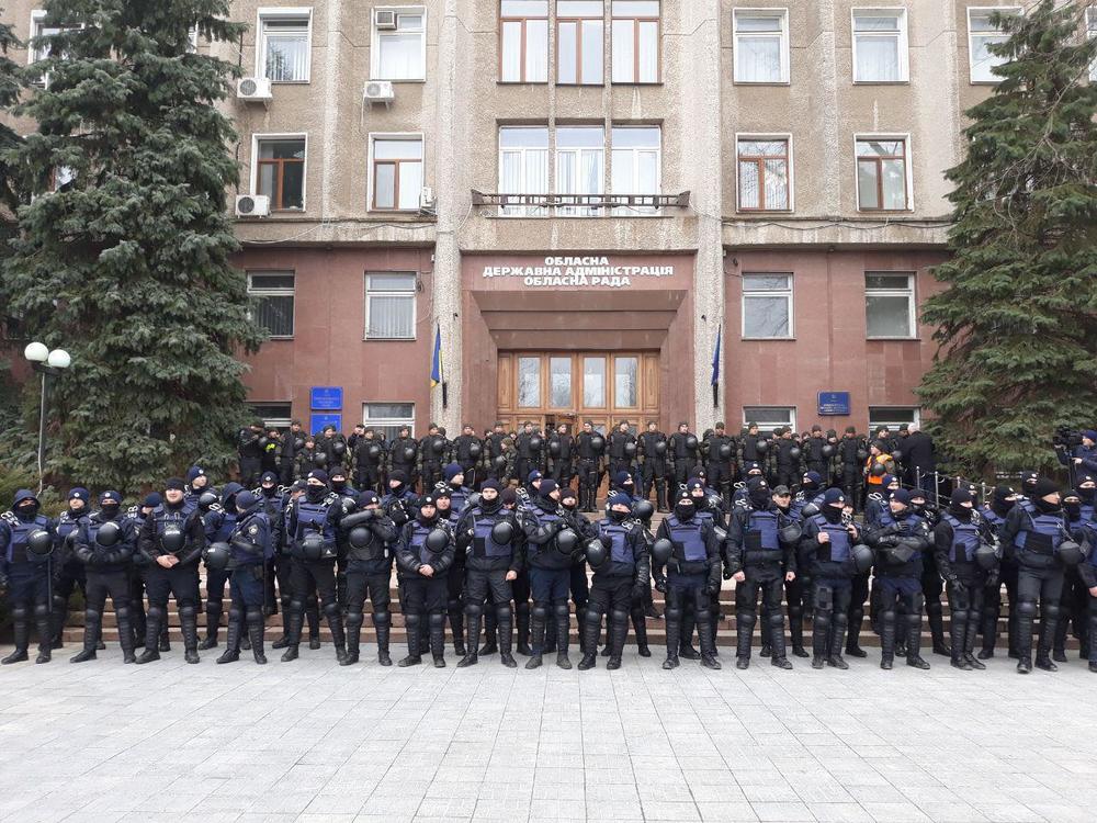 Здание ОГА уже оцеплено силовиками, а самих националистов тщательно досматривают.