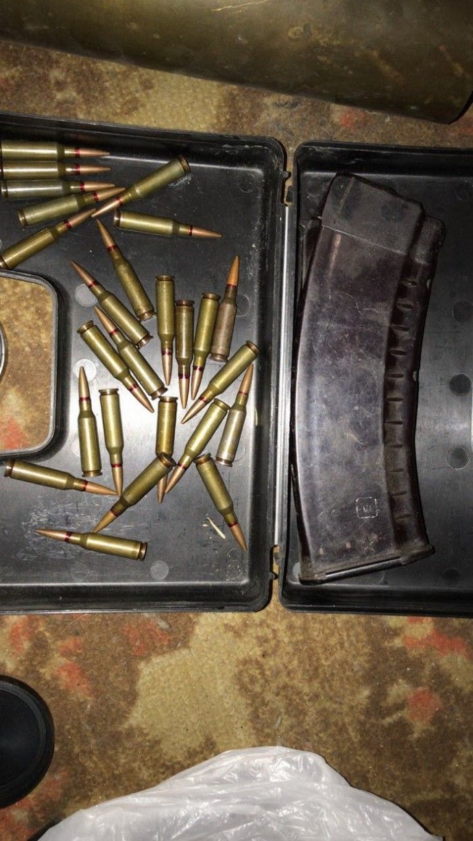 Во время обысков по месту его проживания и работы правоохранители изъяли семь пистолетов и револьверов, три гранаты Ф-1, тротиловую и дымовую шашки, семь взрывпакетов, сигнальную мину, семь единиц холодного оружия и около тысячи патронов различного калибра.