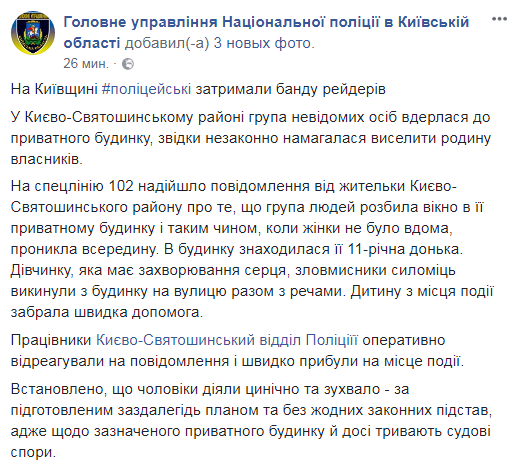 По спецлинии 102 поступило сообщение от жительницы Киево-Святошинского района о том, что группа людей разбила окно в ее частном доме и проникла внутрь. В этот момент женщины-хозяки не было дома, но в там находилась ее 11-летняя дочь.