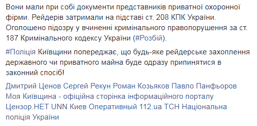 Рейдеров задержали на основании ст. 208 УПК Украины. Объявлен подозрение в совершении уголовного преступления по ст. 187 Уголовного кодекса Украины (разбой).